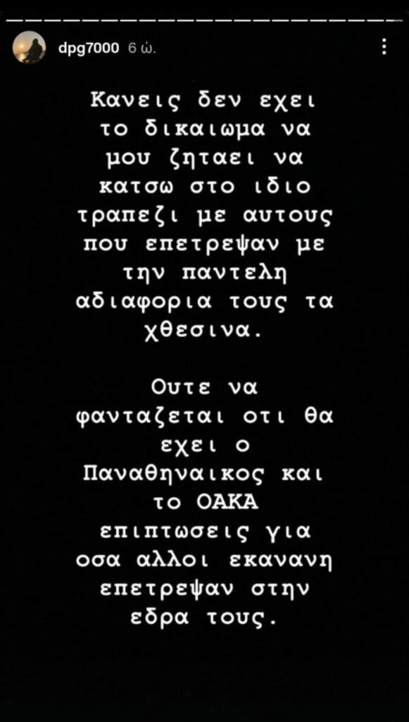 Τα ξημερώματα της Τρίτης (3/6), ο Δημήτρης Γιαννακόπουλος ανέβασε story μέσα από το οποίο ανέφερε το γεγονός ότι κανείς δεν έχει το δικαίωμα να του ζητάει να κάτσει στο ίδιο τραπέζι με εκείνους που επέτρεψαν να συμβούν όσα έγιναν στο ΣΕΦ το βράδυ της Κυριακής και το Game 2 του Ολυμπιακού με τον Παναθηναϊκό.