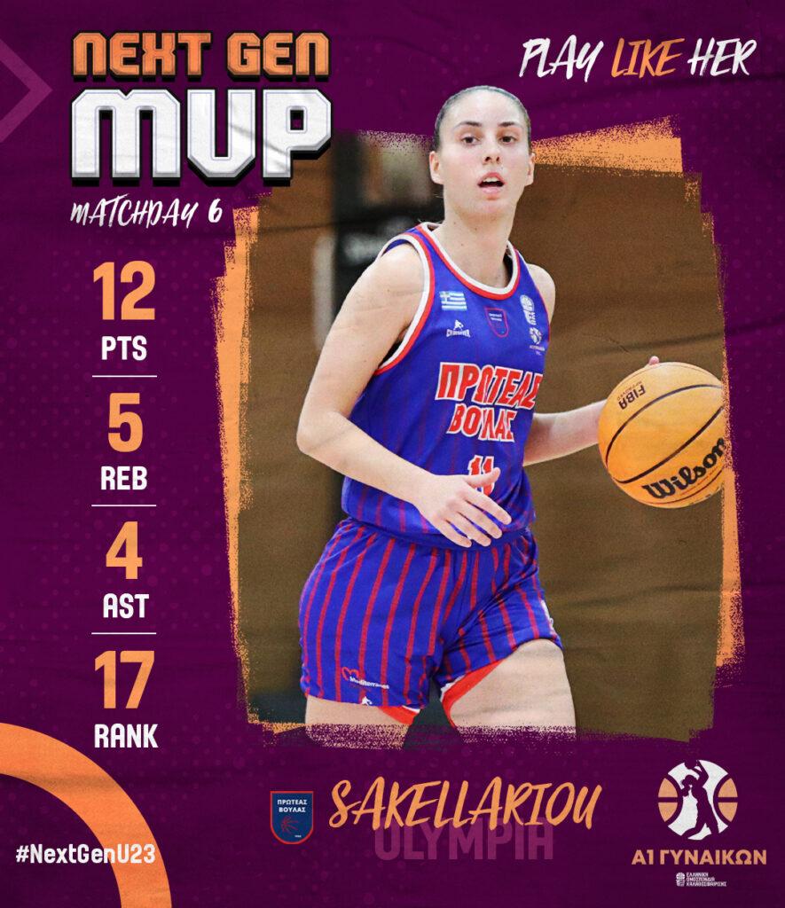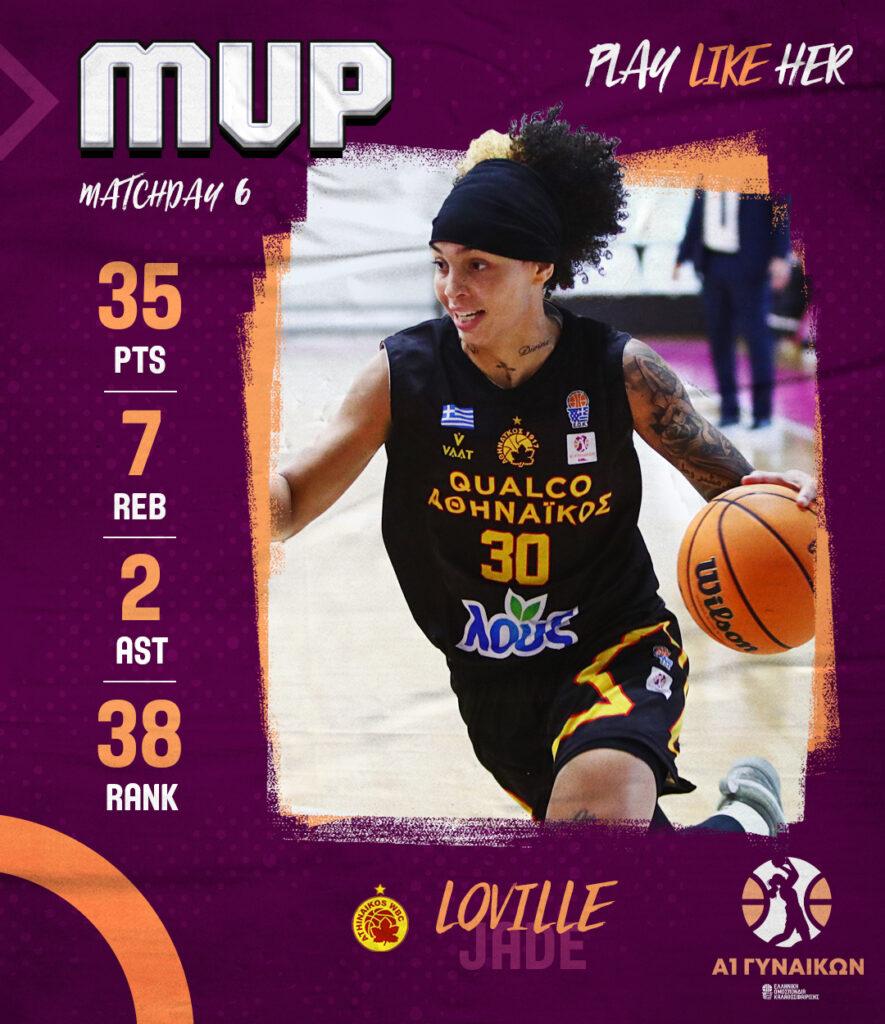 Ο λόγος για την Τζέιντ Λόβιλ του Αθηναϊκού Qualco η οποία αναδείχθηκε και MVP της 6ης Αγωνιστικής και η Ολυμπία Σακελλαρίου του Πρωτέα Βούλας που διακρίθηκε ως η Next Gen MVP U23.