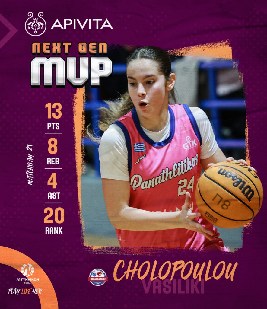 Για 7η φορά η Βασιλική Χωλοπούλου αναδεικνύεται Next Gen στο φετινό πρωτάθλημα. Η 18χρονη πλέι μέικερ στη νίκη του Παναθλητικού με 84-78 επί του ΠΑΟΚ είχε 13 πόντους, 8 ριμπάουντ, 4 ασίστ και 20 στο σύστημα αξιολόγησης μετα από 35’38’’λεπτά συμμετοχής.