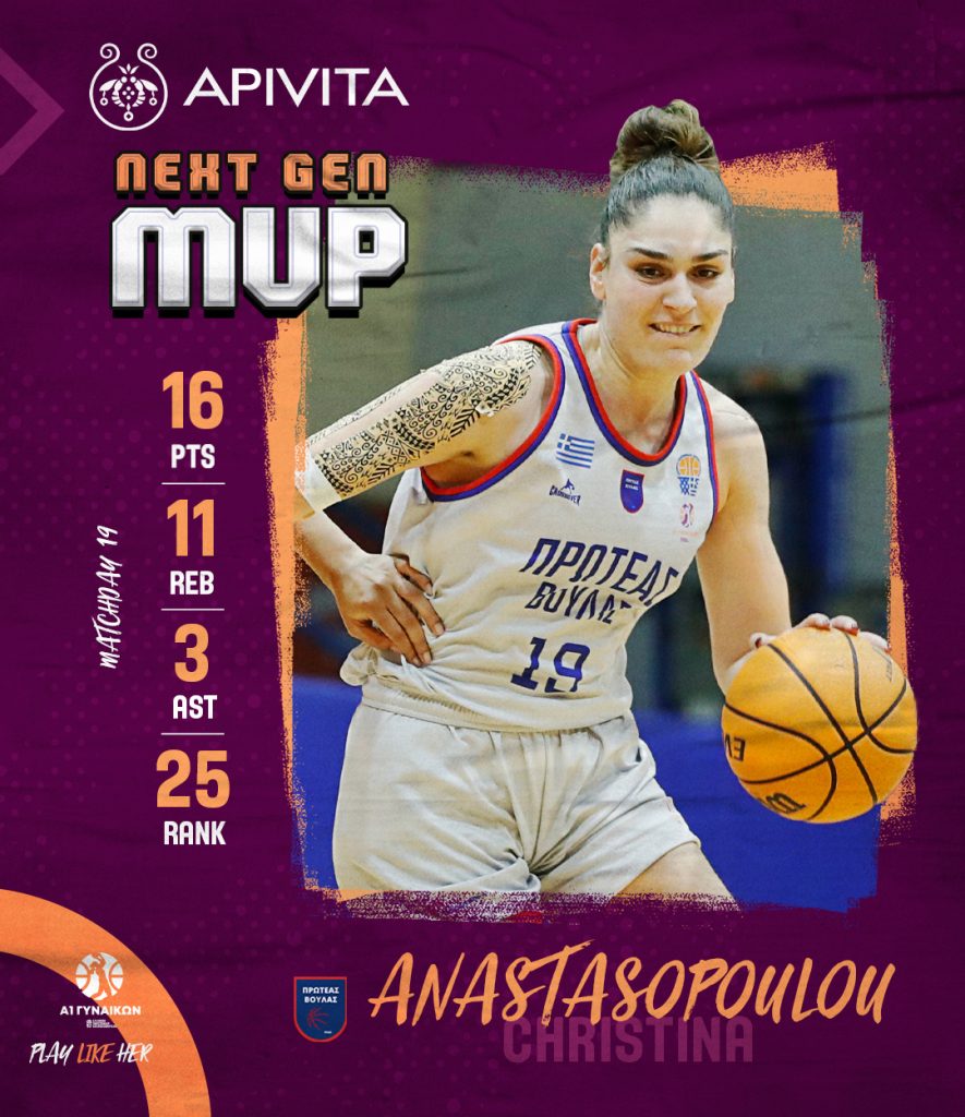 Για δεύτερη φορά η Χριστίνα Αναστασοπούλου αναδεικνύεται MVP Νext Gen, καθώς αντίστοιχη διάκριση είχε κερδίσει και την 4η Αγωνιστική. Η γκαρντ του Πρωτέα Βούλας συνέβαλε στα μέγιστα στην νίκη της ομάδας της με 69-60 επί του Αμύντα τελειώνοντας το παιχνίδι με 16 πόντους, 11 ριμπάουντ, 3 ασίστ, 1 κλέψιμο έχοντας 25 στο σύστημα αξιολόγησης μετά από 34’29’’ συμμετοχής.