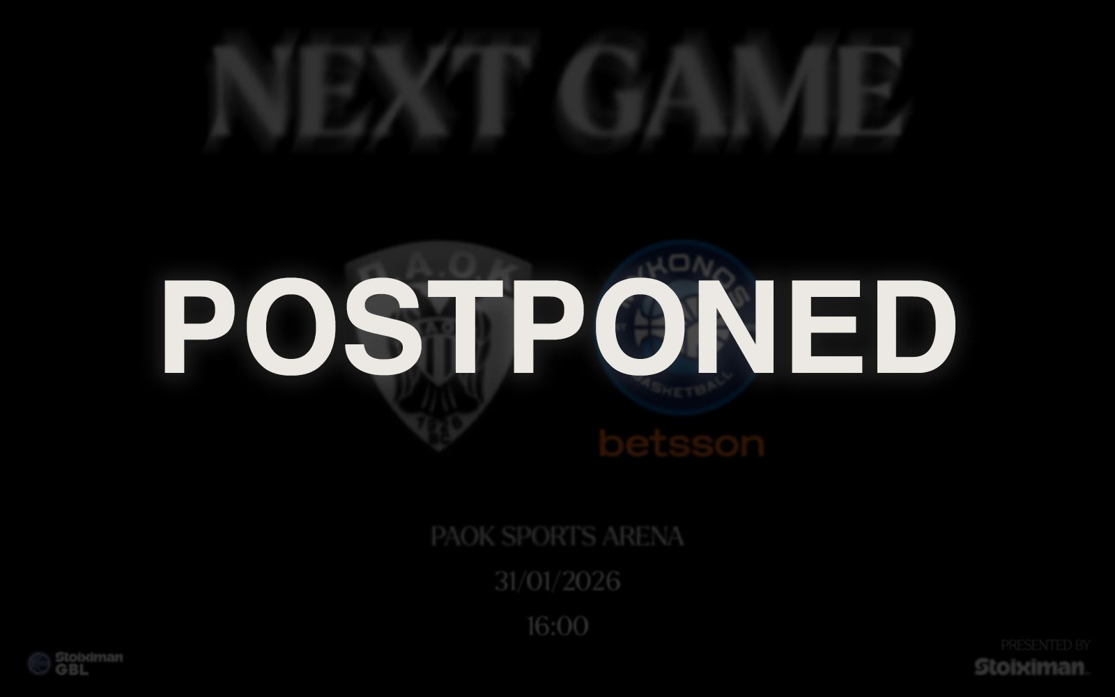 Αναβολή προέκυψε στην αναμέτρηση ΠΑΟΚ – Μύκονος Betsson, η οποία ήταν προγραμματισμένη να διεξαχθεί το Σάββατο 31 Ιανουαρίου 2026, στο πλαίσιο της Stoiximan GBL.