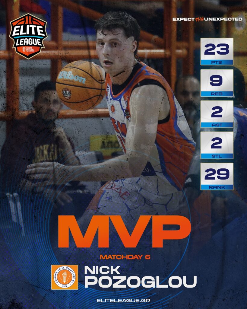 Μεγάλη διάκριση για τον Νικ Πόζογλου, ο οποίος αναδείχθηκε πολυτιμότερος παίκτης της 6ης αγωνιστικής στην Elite League. Ο ομογενής φόργουορντ ήταν ο ηγέτης της Νεανικής Εστίας Μεγαρίδος στη δύσκολη εντός έδρας νίκη επί της ΑΓΕΧ με σκορ 79-78.