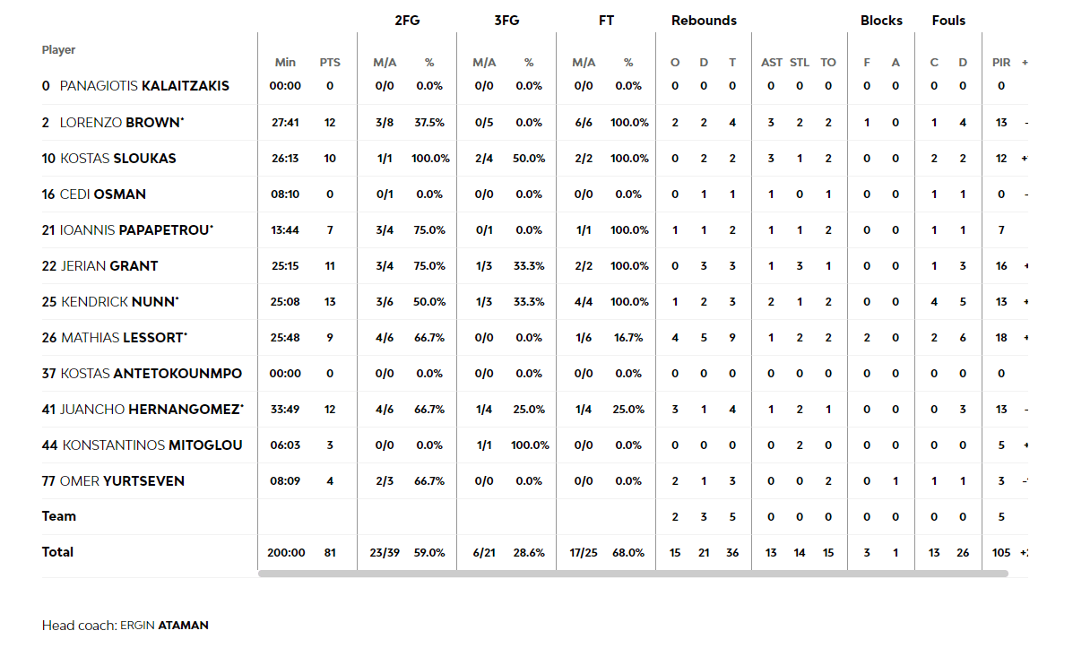 Πρώτος σκόρερ των πρασίνων ήταν ο Κέντρικ Ναν με 13 πόντους (3/6 δίποντα, 1/3 τρίποντα) και 3 ριμπάουντ, ενώ ο Λορέντζο Μπράουν είχε 12 πόντους (3/8 δίποντα, 0/5 τρίποντα) συν 4 ριμπάουντ και 2 κλεψίματα. Επίσης, ο Χουάντσο Ερνανγκόμεθ πρόσφερε 12 πόντους (4/6 δίποντα, 1/4 τρίποντα), 4 ριμπάουντ και 2 κλεψίματα, και ο Κώστας Σλούκας πέτυχε 10 πόντους (1/1 δίποντα, 2/4 τρίποντα) και 3 ασίστ.