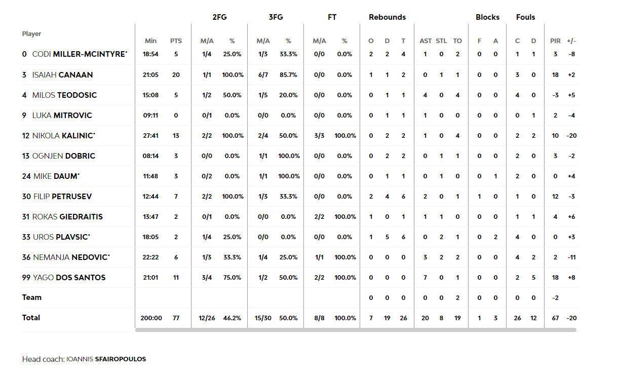 Από την πλευρά του ηττημένου Ερυθρού Αστέρα, ο Αϊσέια Κάνααν ξεχώρισε με 20 πόντους (1/1 δίποντα, 6/7 τρίποντα). Ακολούθησε ο Νίκολα Κάλινιτς με 13 πόντους (2/2 δίποντα, 2/4 τρίποντα), ενώ ο Γιάγκο Ντος Σάντος πέτυχε 11 πόντους (3/4 δίποντα, 1/2 τρίποντα) και 7 ασίστ.