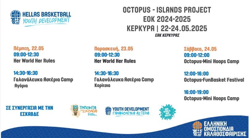 Η κεντρική σκηνή του ΕΑΚ Κέρκυρας ανήκει το Σάββατο 24 Μαϊου στο πιο μπασκετικό… χταπόδι: Το Octopus Mini Hoops Camp και το Octopus Fun Basket Festival βρίσκουν την δική τους θέση στο πρόγραμμα. Το Octopus Mini Hoops αφορά αγόρια και κορίτσια 9-12 στών, θα φιλοξενηθεί στο ΕΑΚ Κέρκυρας και θα πάρουν μέρος τα σωματεία Κερκυραϊκός Γυμναστικός Σύλλογος, Ναυσίθοος Ναυτικός ΑΟ Κέρκυρας και ο Αθλητικός Σϋλλογος Λέων Κέρκυρας.