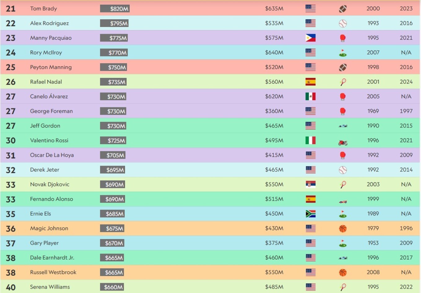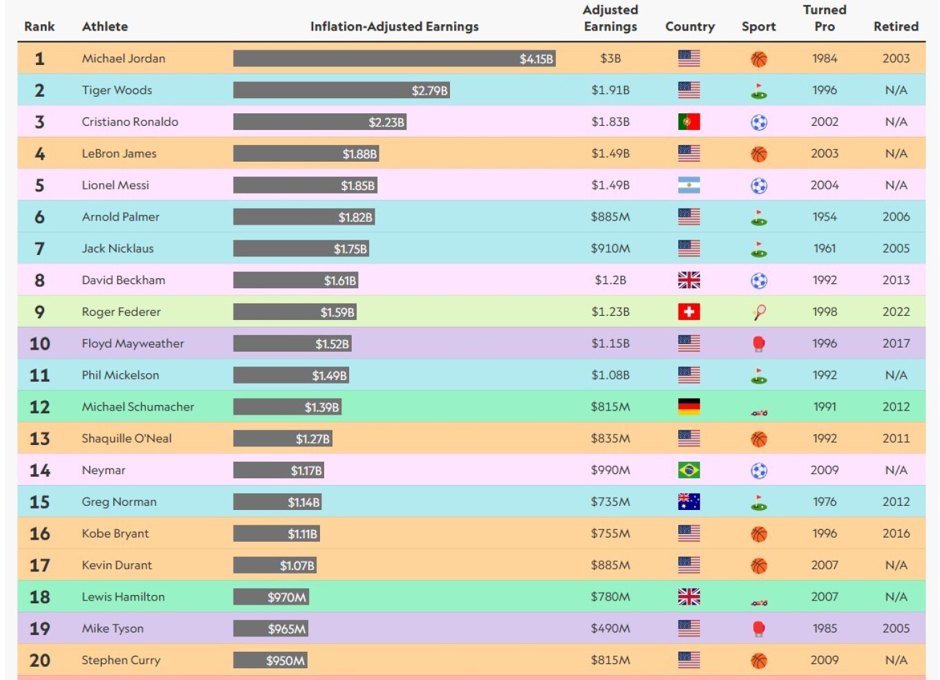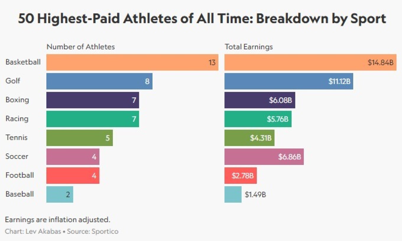 Σύμφωνα με ανάλυση της ιστοσελίδας Sportico, οι 50 πιο επικερδείς αθλητές όλων των εποχών έχουν συγκεντρώσει συνολικά 53,2 δισεκατομμύρια δολάρια – ποσό που, με βάση τον πληθωρισμό, μεταφράζεται σε 37,7 δισ. Οι εκτιμήσεις βασίζονται σε πληροφορίες από το Forbes, το Sports Illustrated και πηγές της αγοράς.