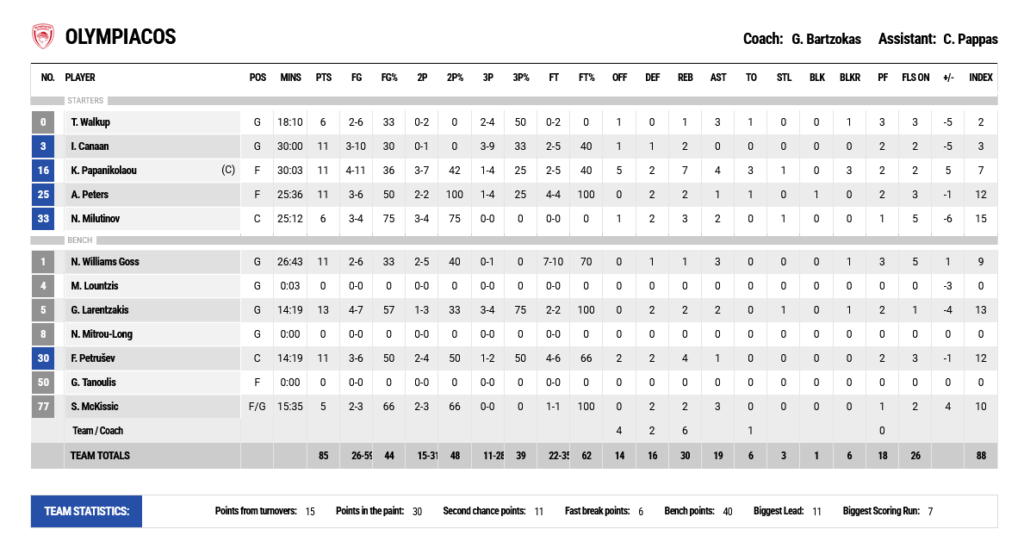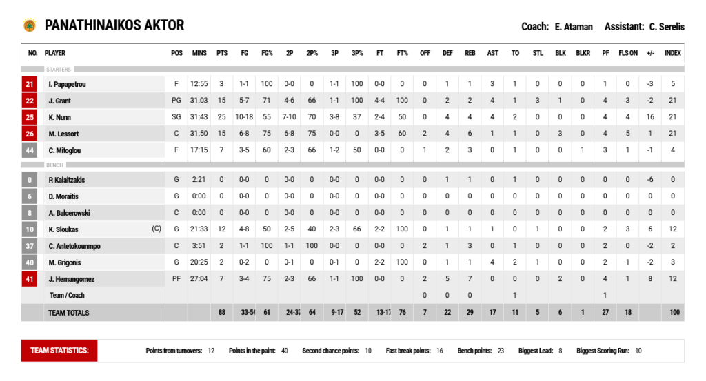 Ο Γιαννούλης Λαρεντζάκης με 13 πόντους ήταν ο πρώτος σκόρερ των γηπεδούχων που είχαν πέντε ακόμη παίκτες με 11 πόντους, ωστόσο έκαναν μόλις 22/35 ελεύθερες βολές σε ένα πολύ τεταμένο και άσχημο παιχνίδι.