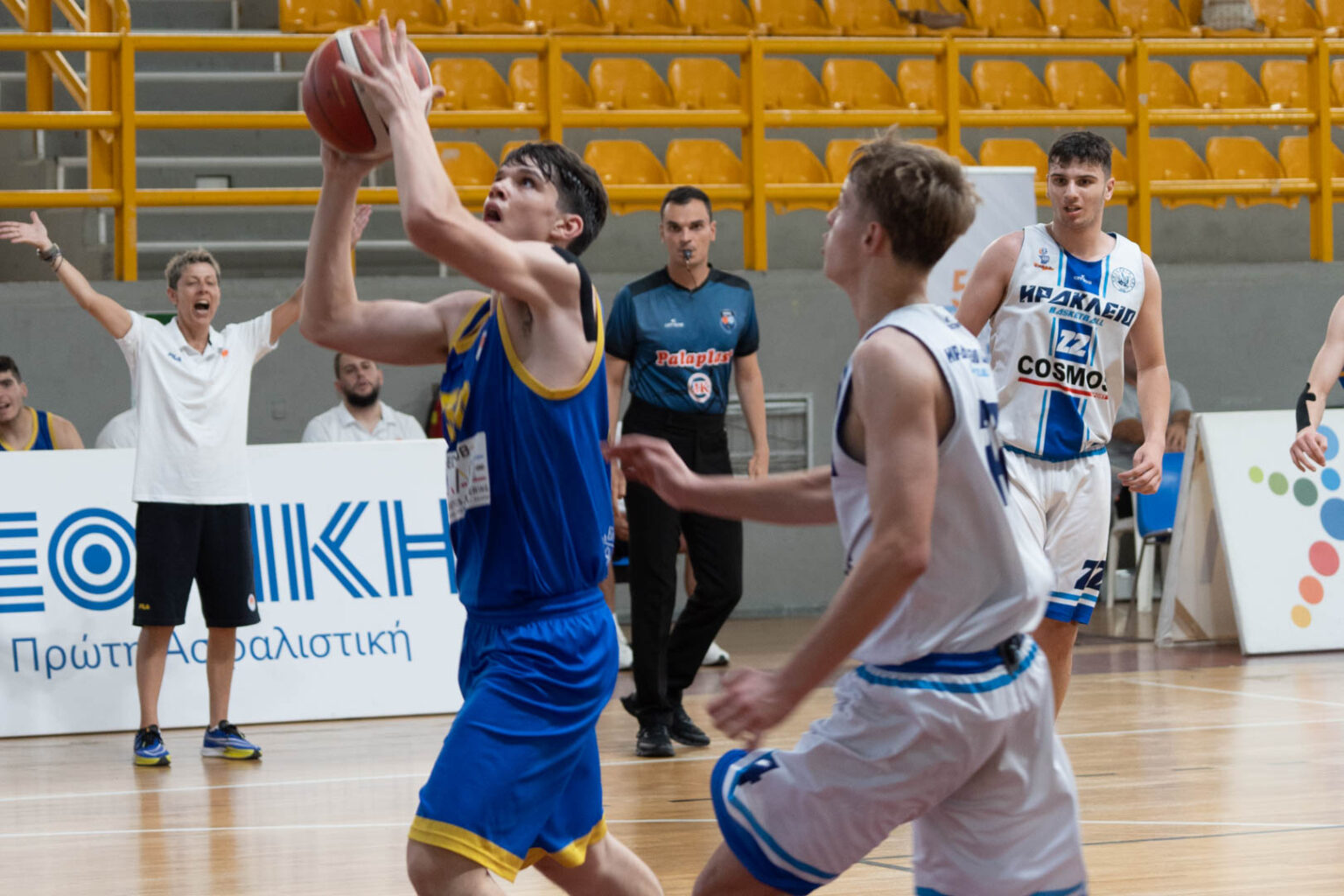 Στα πρώτα πέντε λεπτά του αγώνα το σκορ κυμάνθηκε σε πολύ χαμηλά επίπεδα (5-5). Αμέσως μετά το Περιστέρι έκανε σερί 5-0 με αποτέλεσμα το Ηράκλειο να πάρει το πρώτο τάιμ-άουτ του παιχνιδιού. Το προβάδισμα των παικτών της Αττικής διατηρήθηκε σε αυτά τα επίπεδα μέχρι το 12ο λεπτό όταν ο Χαϊδεμένος με δύο βολές έδωσε για πρώτη φορά διψήφια διαφορά στην ομάδα του (17-7). Οι Κρητικοί μείωσαν σε 18-15 με βολές του Λογοθέτη, 4΄11΄΄ πριν την ανάπαυλα, όμως το Περιστέρι με σερί 13-4 έκλεισε τη δεύτερη περίοδο προηγούμενο με 31-19.