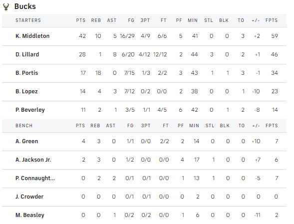 Από την πλευρά των Μπακς ο Κρις Μίντλετον ήταν αμφίβολος πριν την έναρξη του παιχνιδιού αλλά τελικά έπαιξε και ήταν κυριαρχικός. Ο γκαρντ/φόργουορντ σημείωσε 42 πόντους, 10 ριμπάουντ και 5 ασίστ αλλά αυτό δεν ήταν αρκετό. Ακολούθησε ο Ντέμιαν Λίλαρντ με 28 πόντους, 8 ασίστ και 3κλεψίματα και ο Μπόμπι Πόρτις με 17 πόντους και 18 ριμπάουντ.