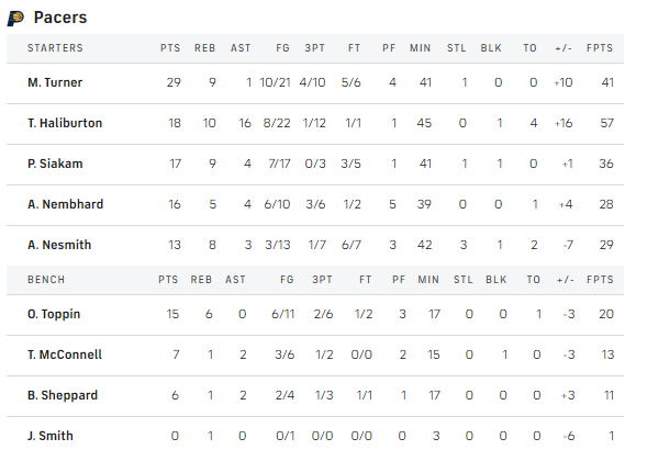Ο Χάλιμπερτον είχε τριπλ-νταμπλ με 18 πόντους, 16 ασίστ και 10 ριμπάουντ. Ο Μάιλς Τέρνερ πρόσθεσε 29 πόντους και 9 ριμπάουντ, για να δώσει στην Ιντιάνα τις πρώτες της συνεχόμενες νίκες στα πλέι οφ μετά τη σεζόν 2014.