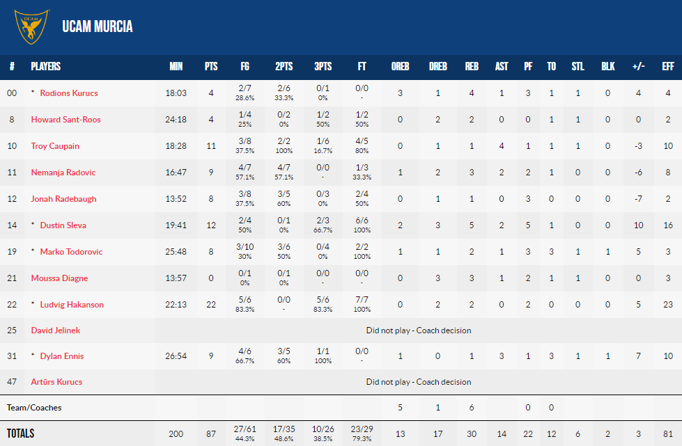 Για την ομάδα της Μούρθια πρώτος σκόρερ ήταν ο Λούντβιγκ Χάκανσον με 22 πόντους και 2 ριμπάουντ, ενώ ο Ντάστιν Σλέβα ακολούθησε με 12 πόντους, 5 ριμπάουντ και 2 ασίστ. Ο μόνος ακόμη διψήφιος ήταν ο Τρόι Κοπέν με 11 πόντους και 4 ασίστ.