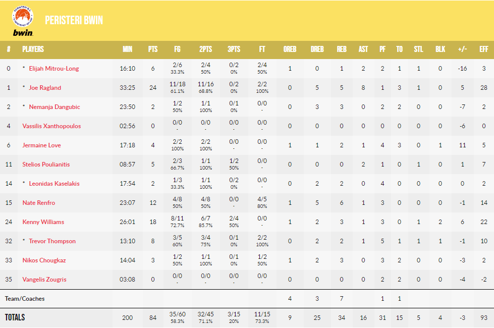 Από την πλευρά του Περιστερίου ο Τζο Ράγκλαντ, ο οποίος ήταν στην καλύτερη πεντάδα του BCL, ήταν ο κορυφαίος του αγώνα καθώς σημείωσε 24 πόντους, 8 ασίστ και 5 ριμπάουντ. Ο Κένι Γουίλιαμς ήταν κομβικός με 18 πόντους και 3 ριμπάουντ και ο Νέιτ Ρένφρο συνείσφερε 12 πόντους και 6 ριμπάουντ.