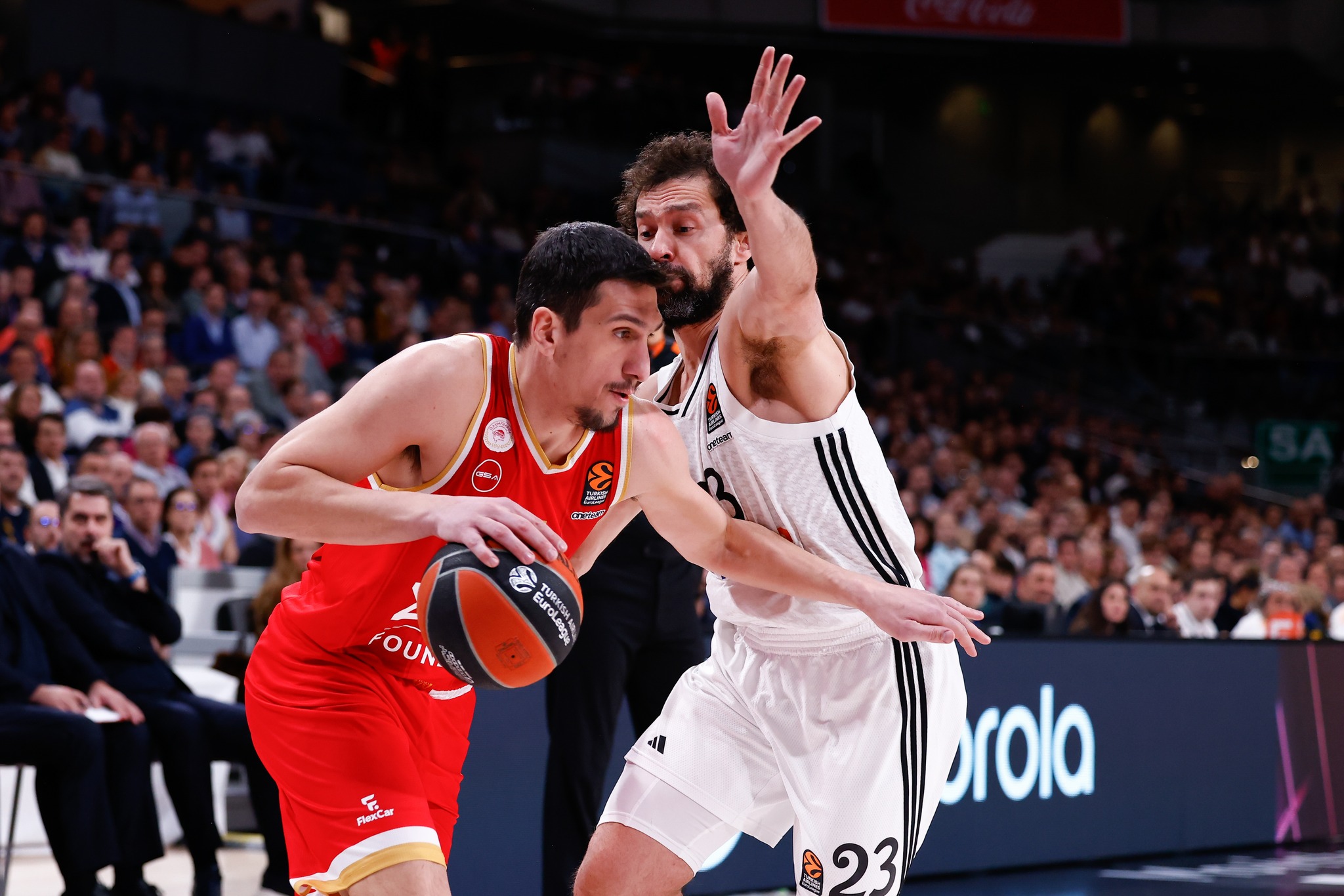 Ο Ολυμπιακός ξεκίνησε μουδιασμένα το παιχνίδι κόντρα στην ομάδα του Τσους Ματέο (11-5, 3′), όμως γρήγορα βρήκε τα πατήματά του και στις δύο πλευρές του παρκέ και πήρε τον έλεγχο του αγώνα. Με πρωταγωνιστή επιθετικά τον Εβάν Φουρνιέ και τον Κώστα Παπανικολάου να προσφέρει σε άμυνα κι επίθεση, έτρεξε ένα επιμέρους 1-14 και τέθηκε επικεφαλής (12-19, 8′). Ένα τρίποντο του αρχηγού διαμόρφωσε το 14-22 λίγο αργότερα, με τη Ρεάλ να μαζεύει τη διαφορά εκμεταλλευόμενη κάποιες κακές επιλογές της «ερυθρόλευκης» επίθεσης στο τελευταίο δίλεπτο και την περίοδο να κλείνει στο 19-22. Στο δεύτερο δεκάλεπτο, οι Εβάν Φουρνιέ και Σακίλ ΜακΚίσικ με 4 γρήγορους πόντους έδωσαν αέρα 7 πόντων στην ομάδα μας (19-26), που ήλεγχε το παιχνίδι και στις δύο πλευρές του παρκέ. Οι Γιαννούλης Λαρεντζάκης και Λούκα Βιλντόζα «τάισαν» τον Νίκολα Μιλουτίνοφ με τον Σέρβο σέντερ να καρφώνει εντυπωσιακά (21-28, και 23-31), ενώ ο Σακίλ ΜακΚίσικ «χτύπησε» από τα 6.75μ. για το 29-36 (17′). Η διαφορά έφτασε σε διψήφιο επίπεδο (37-47, 28″) με πέντε πόντους του Σάσα Βεζένκοφ, με το ημίχρονο να ολοκληρώνεται στο 38-47.