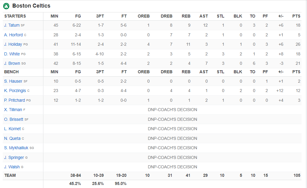 Ο Τζρου Χόλιντεϊ ήταν ο πρώτος σκόρερ των Σέλτικς με 26 πόντους συν 11 ριμπάουντ. Ακολούθησε ο Τζέιλεν Μπράουν με 21 πόντους, 7 ασίστ και 3 κλεψίματα, ενώ ο Τζέισον Τέιτουμ ήταν 1 ριμπάουντ μακριά από το τριπλ νταμπλ με 18 πόντους, 12 ασίστ και 9 ριμπάουντ.