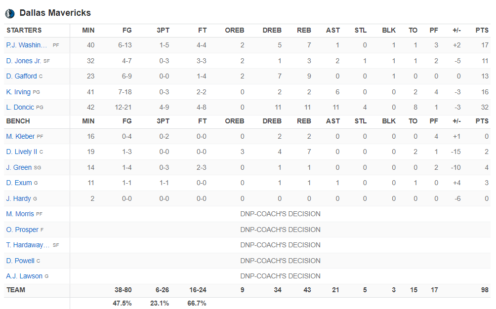 Από την πλευρά των Μάβερικς, ο καταπονεμένος Ντόντσιτς, κατάφερε παρά τους τραυματισμούς του να κάνει τριπλ νταμπλ με 32 πόντους, 11 ριμπάουντ 11 ασίστ και 4 κλεψίματα. Ο Πι Τζέι Γουάσινγκτον είχε 17 πόντους και 7 ριμπάουντ.