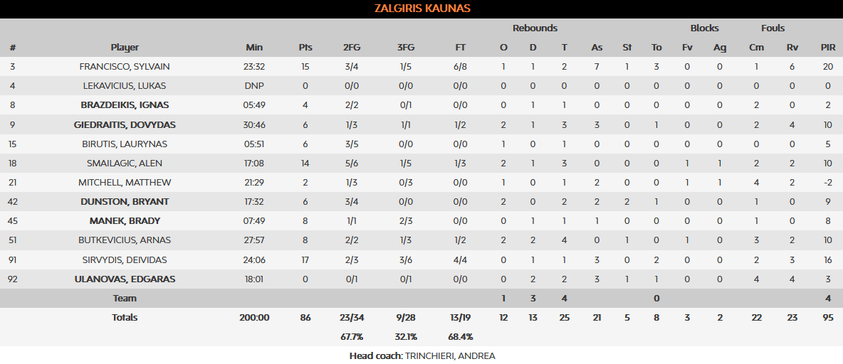 Όμως με ένα λάθος του Κάλινιτς και ένα επιθετικό, η ομάδα του Σφαιρόπουλου έχασε τις ευκαιρίες της, μέχρι που ο Φρανσίσκο διαμόρφωσε το 82-79 στα 30”. Το φινάλε όμως έκρυβε τρελές συγκινήσεις. Ο ΜακΙντάιρ βρήκε τρίποντο ισοφάρισης στο 1” αλλά ο Ντάνστον είπε την τελευταία λέξη, σκοράροντας στο μηδέν για την τεράστια νίκη της Ζάλγκιρις.